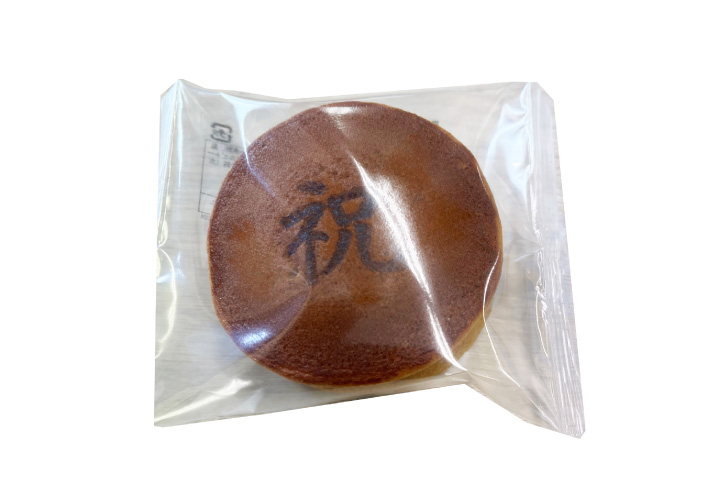 こだわりの自家製つぶ餡をはさんだ黒糖どら焼き「日々是くろどら」に「祝」の文字を押しました。